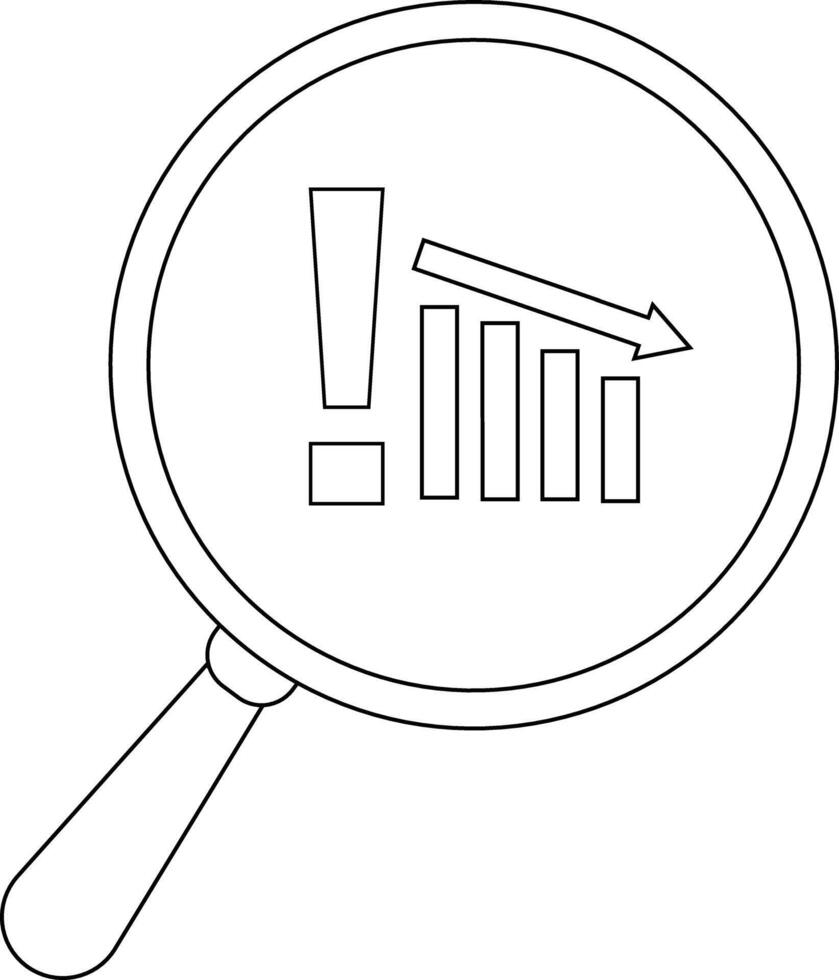 Magnifying glass focuses on an exclamation point and downward sloping bar graph vector
