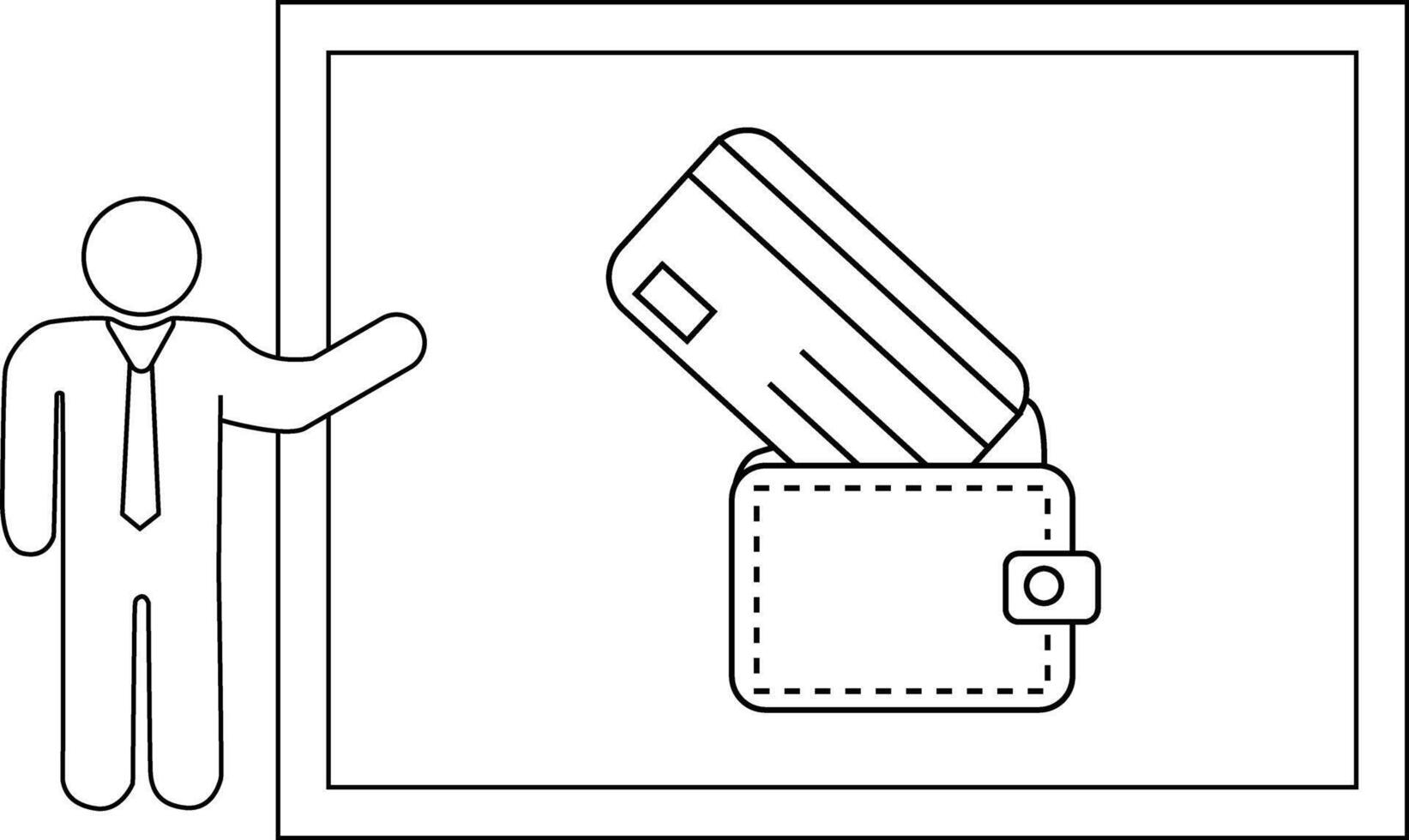 An illustration of a presenter pointing to a wallet with a card sticking out all contained within a frame vector