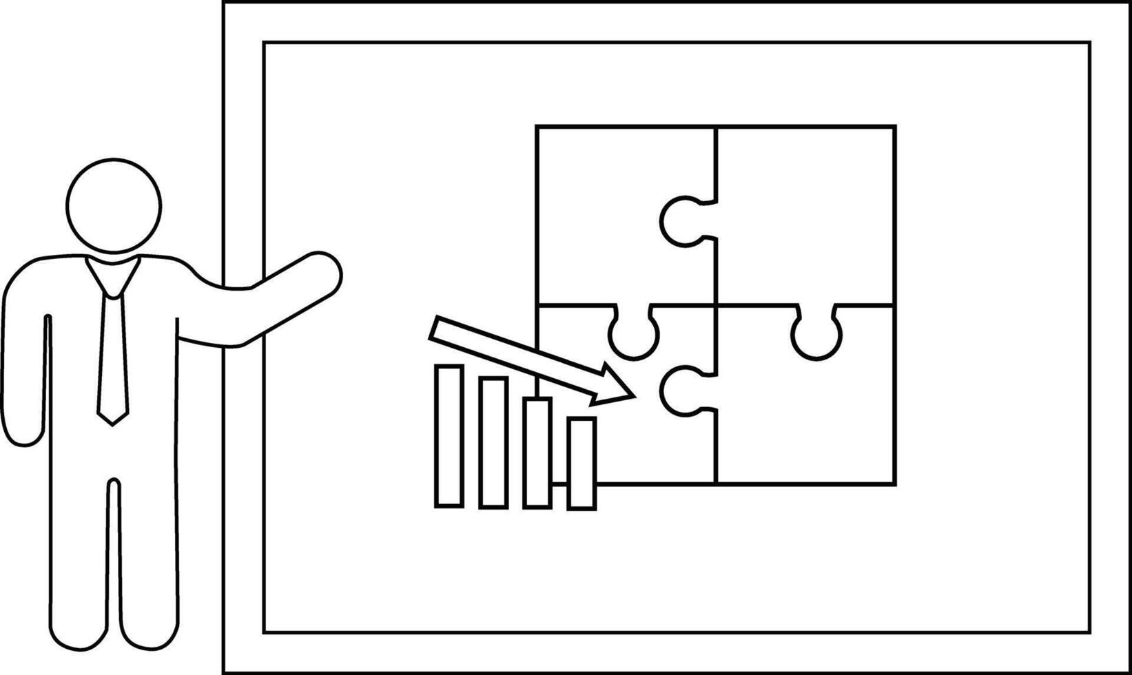 A stick figure presenting a chart pointing at puzzle pieces framed by a presentation board vector