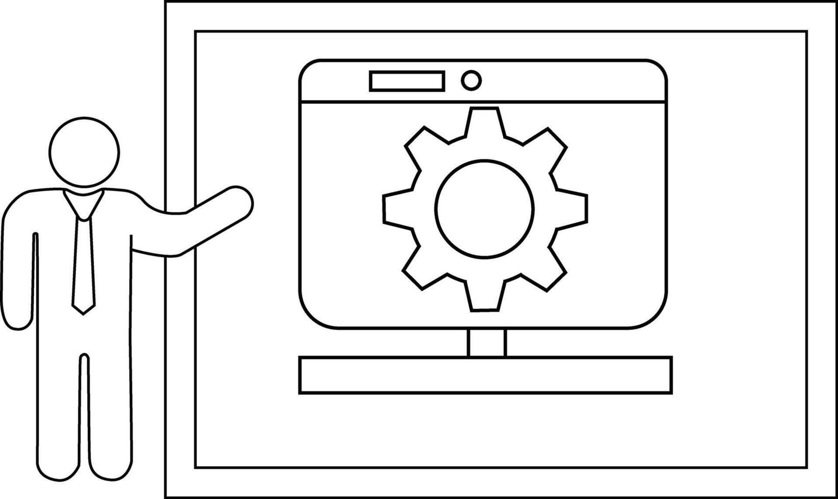 A stick figure points at a screen displaying a gear all within a framed outline vector