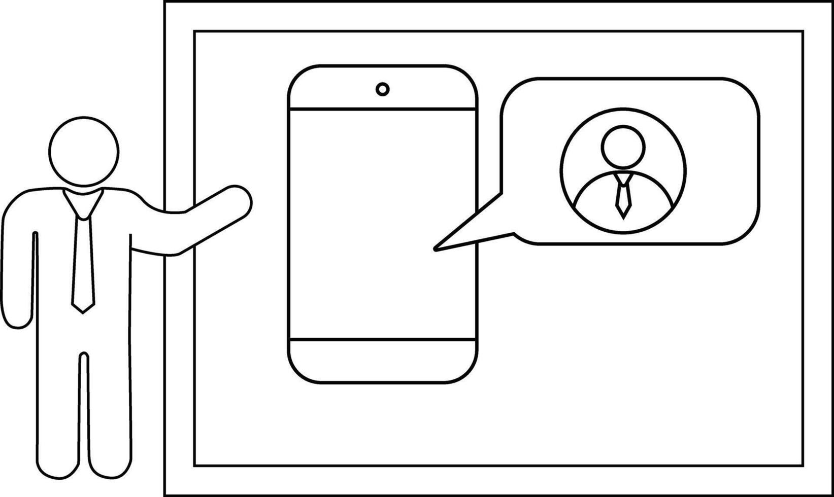 Line art depicts a figure presenting a phone with a contact in a speech bubble within a rectangular frame vector