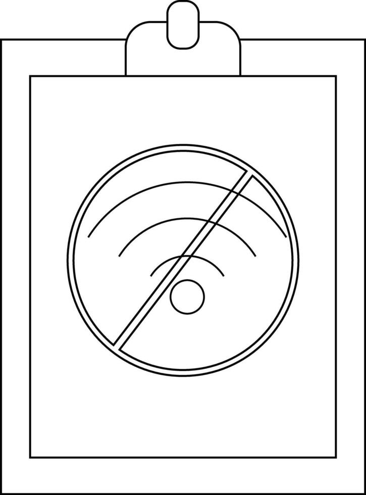 A clipboard displays a no wifi symbol a circle bisected with radio wave arcs and a diagonal line vector