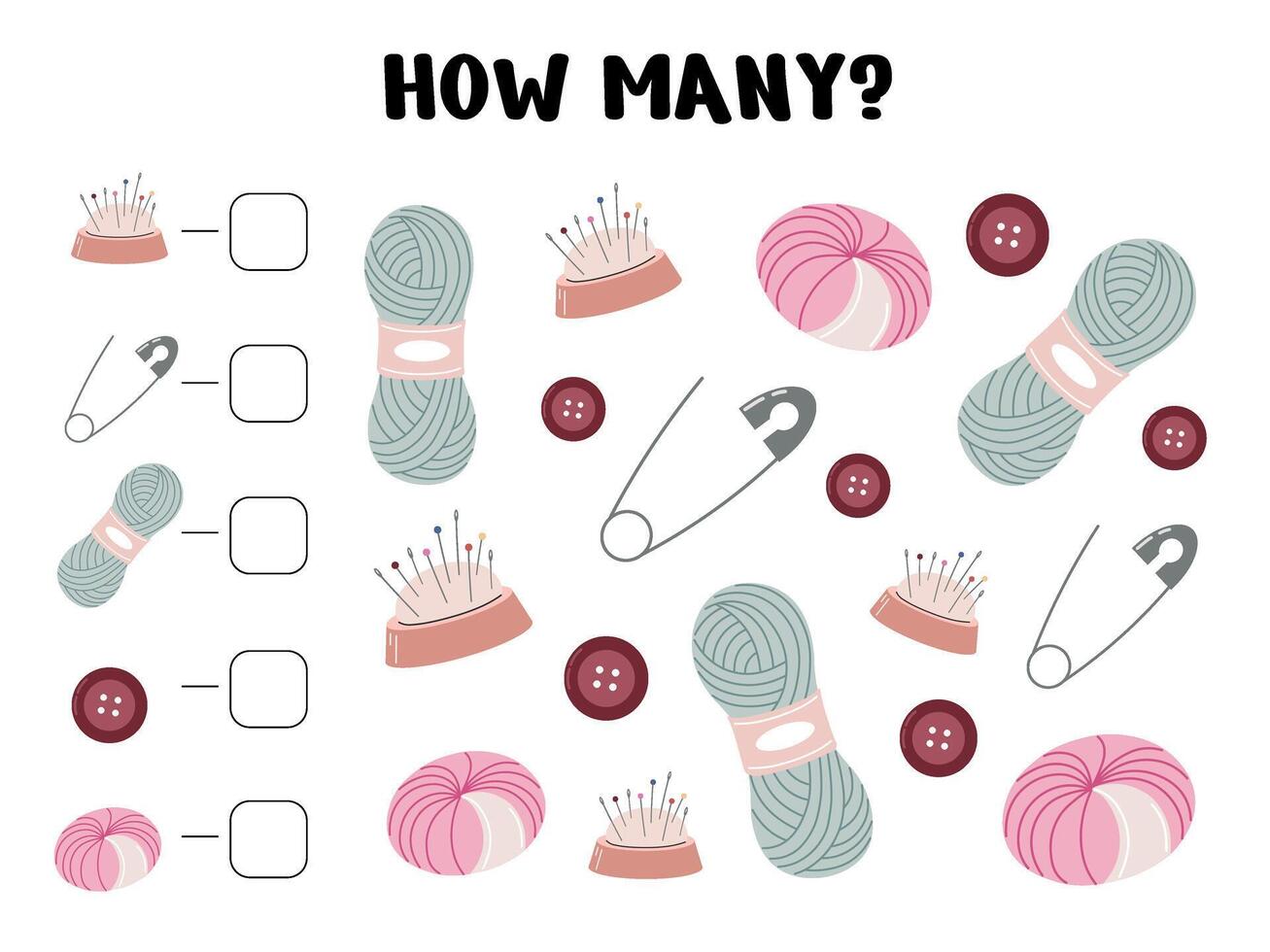 How Many Activity Page with Yarn, Buttons, and Pins Pro Vector
