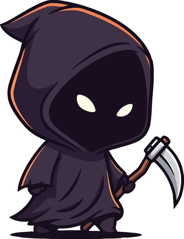 A charming little grim reaper character stands ready with a shiny scythe. Pro Vector