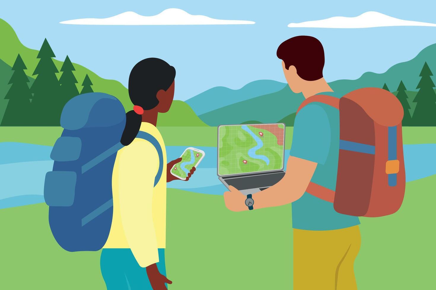 Hikers with backpacks using map and GPS in nature Pro Vector