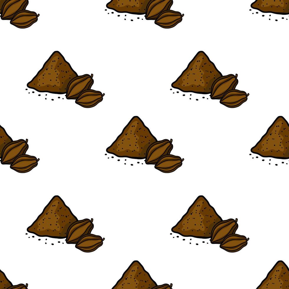 A repeating pattern of cocoa pods and rich brown cocoa powder, creating a warm, earthy background. Pro Vector
