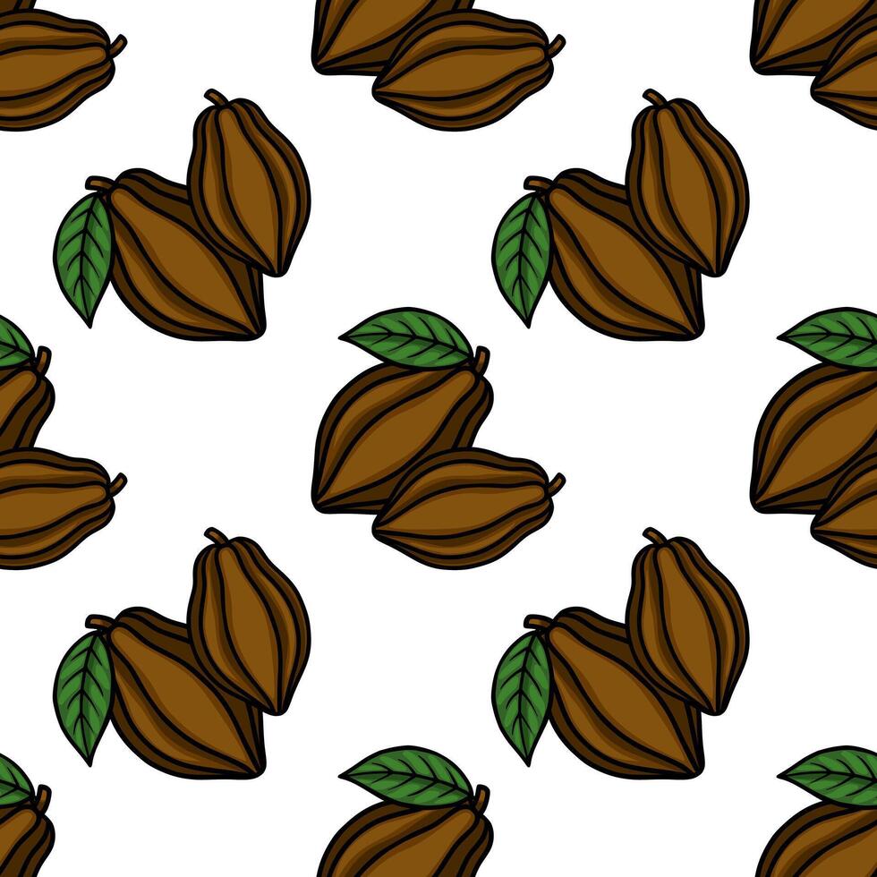 Seamless pattern of stylized brown cocoa pods with green leaves, showcasing a simple, repeating design perfect for food-related backgrounds. Pro Vector