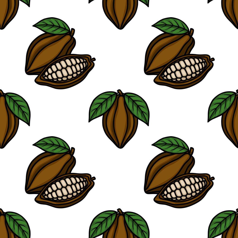 Seamless pattern of cocoa pods with exposed beans and green leaves, rendered in a charming, hand-drawn style on a white background. Pro Vector