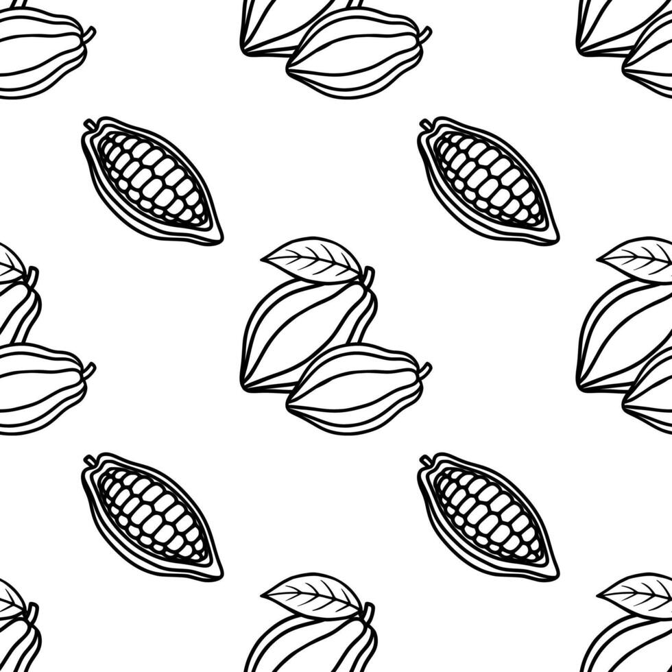 Seamless pattern featuring hand-drawn cocoa pods and beans, with a focus on their internal structure and delicate leaves, presented in a clean, minimalist black and white line art style. Pro Vector