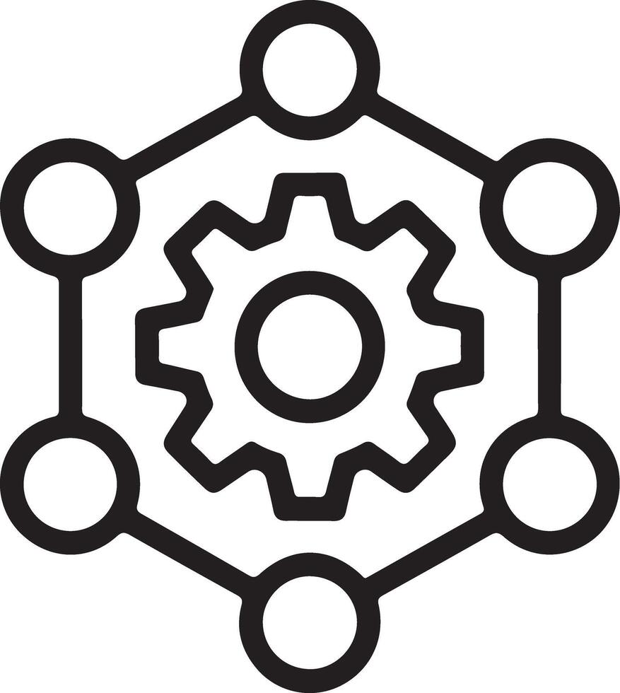 Abstract hexagonal network structure with central gear symbolizing connection and process Pro Vector