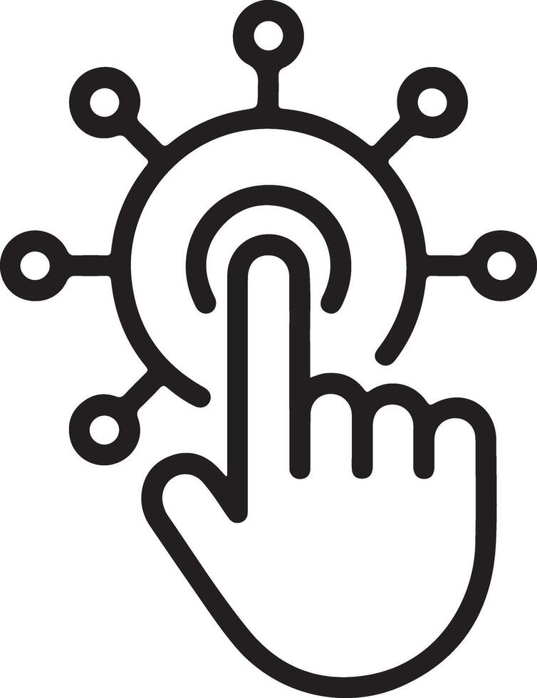 Digital interaction hand touching interactive touchscreen interface with connected network nodes Pro Vector