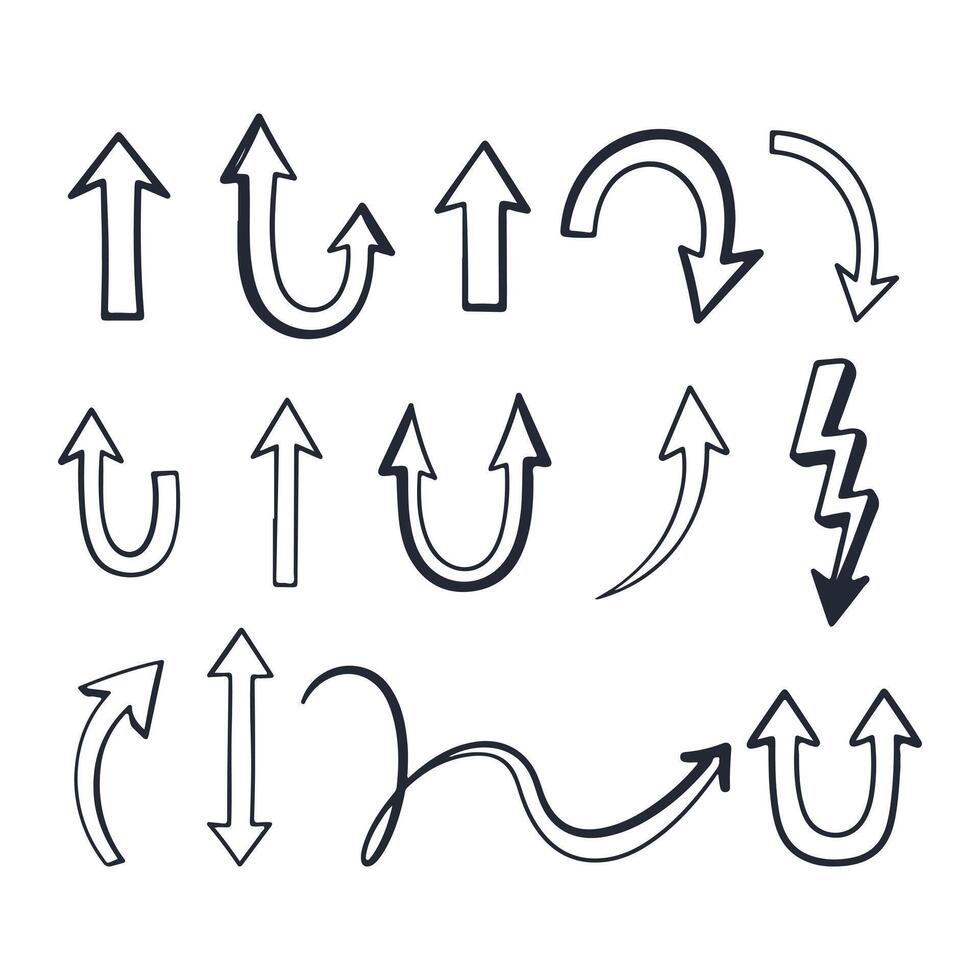 Handdrawn u turn curve arrows pointer icon set, including curved, straight, and lightning bolt shapes Pro Vector