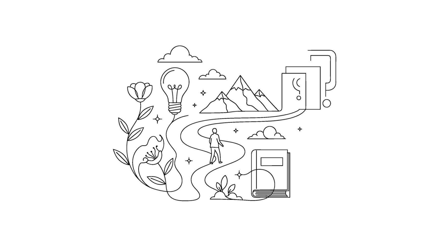 Minimalist line art illustration of a person walking on a winding path toward mountains and question marks symbolizing discovery knowledge and inspira Free Vector