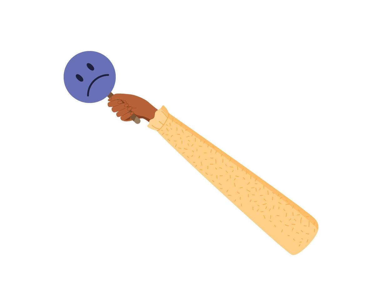Flat hand hold circle with bad feedback symbol. Animated arm display customer opinion and client satisfaction. Isolated element for review, survey, or business rating. Pro Vector