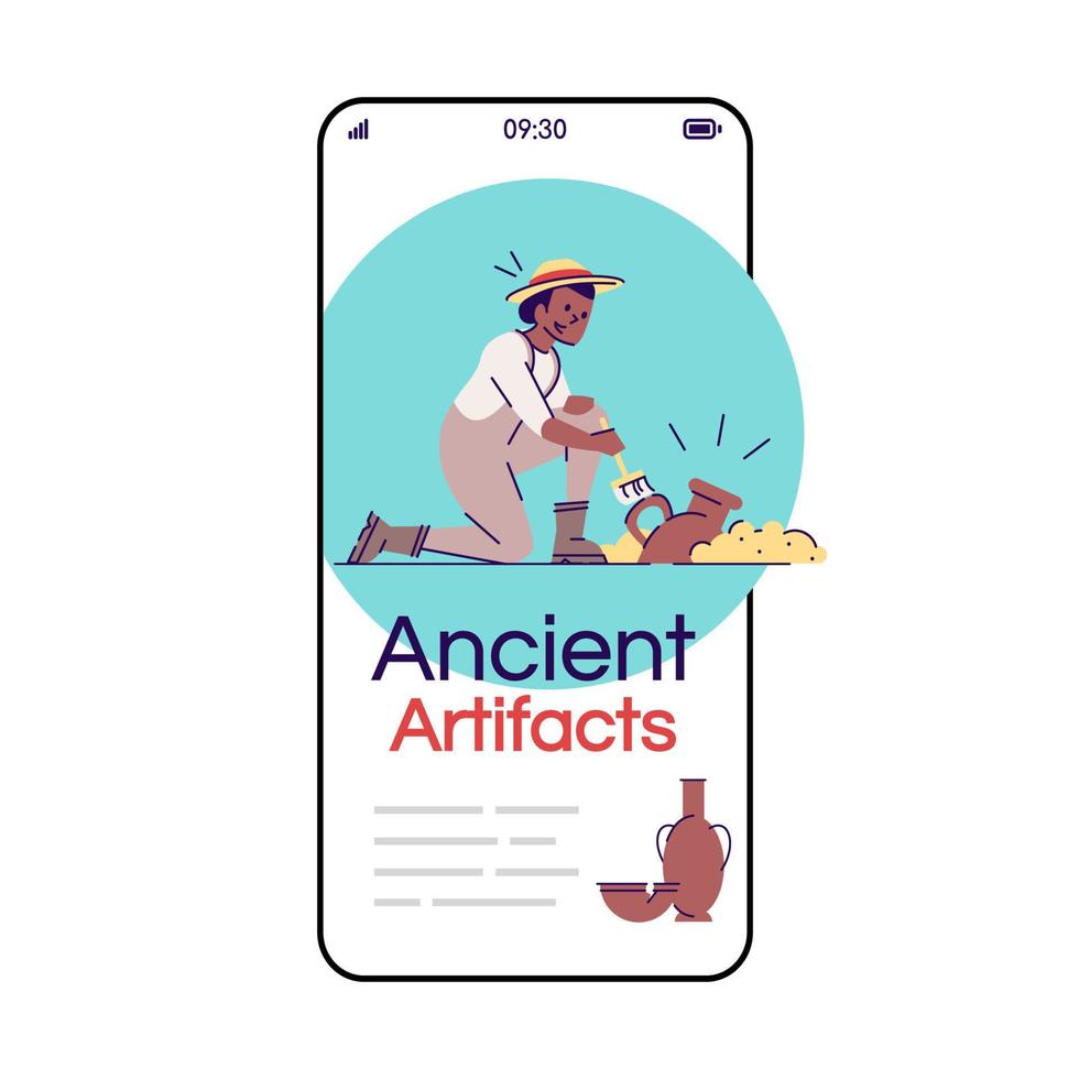 Ancient artifacts social media posts smartphone app screen. Mobile phone displays with cartoon characters design mockup. Ancient history. Archeology excavations application telephone interface Pro Vector