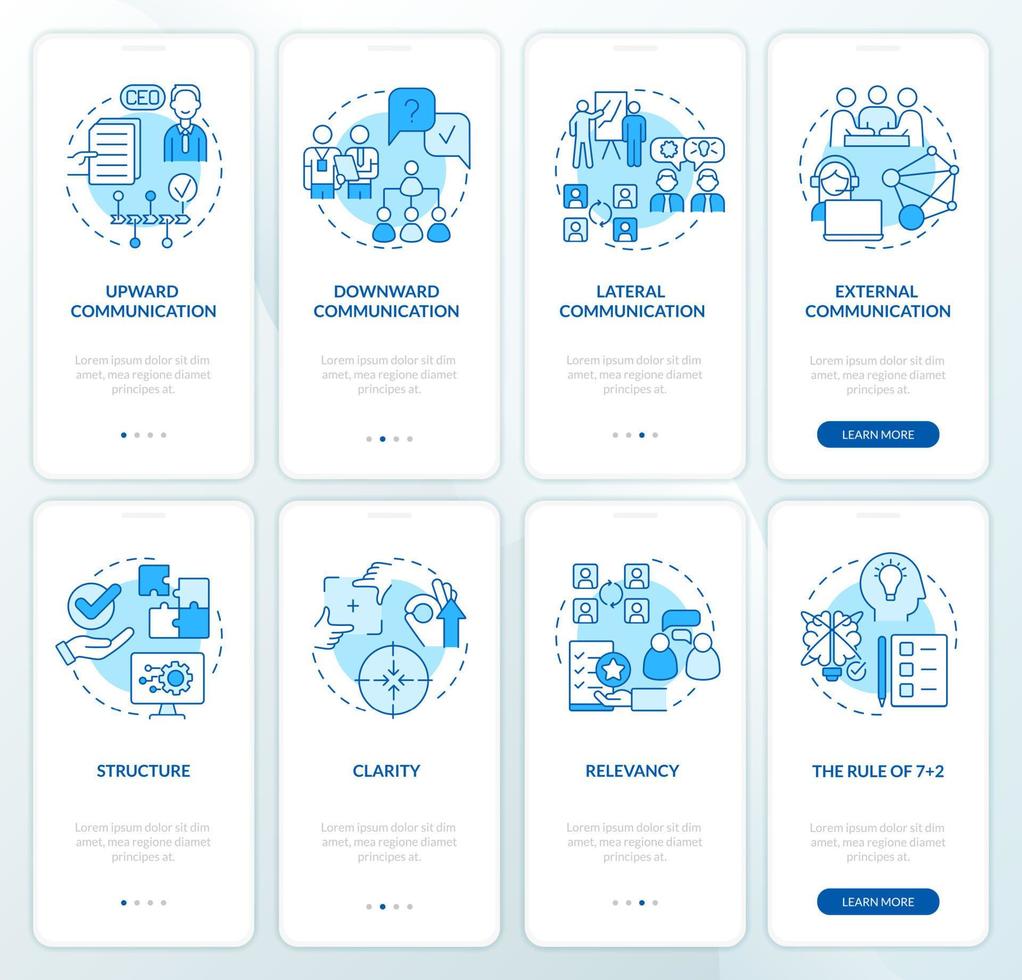 Workplace communication blue onboarding mobile app screen set. Walkthrough 4 steps graphic instructions pages with linear concepts. UI, UX, GUI template. Myriad Pro-Bold, Regular fonts used Pro Vector