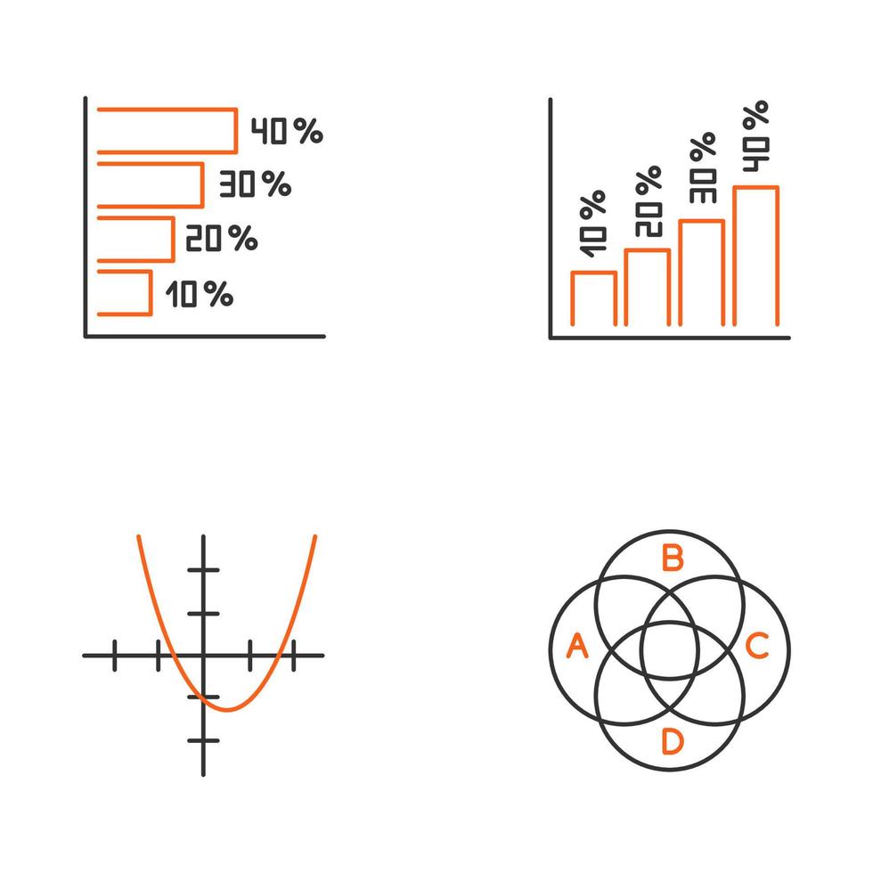 Chart and graph linear icons set. Histogram. Function curve. Venn diagram. Trigonometry study. Business. Thin line contour symbols. Isolated vector outline illustrations. Editable stroke Pro Vector