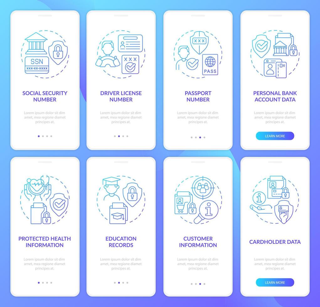 Sensitive information blue gradient onboarding mobile app screen set. Walkthrough 4 steps graphic instructions pages with linear concepts. UI, UX, GUI template. Myriad Pro-Bold, Regular fonts used Pro Vector