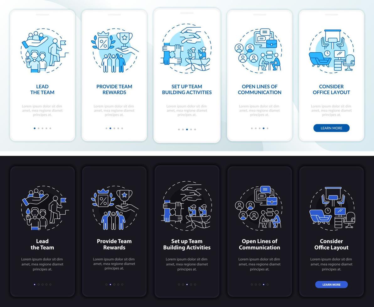 Teamwork process night and day mode onboarding mobile app screen. Tips walkthrough 5 steps graphic instructions pages with linear concepts. UI, UX, GUI template. Myriad Pro-Bold, Regular fonts used Pro Vector