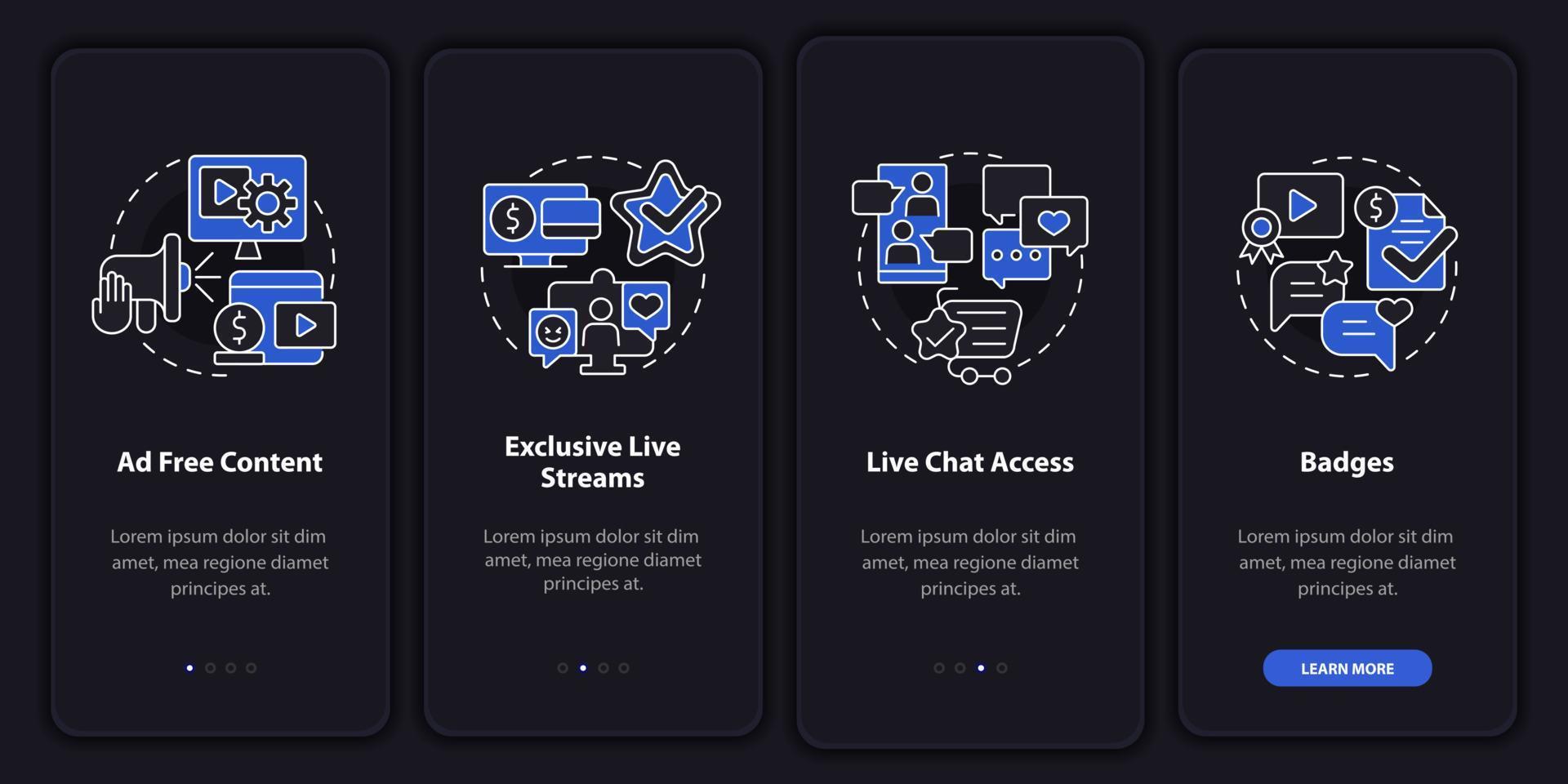 Paid subscription features night mode onboarding mobile app screen. Walkthrough 4 steps graphic instructions pages with linear concepts. UI, UX, GUI template. Myriad Pro-Bold, Regular fonts used Pro Vector