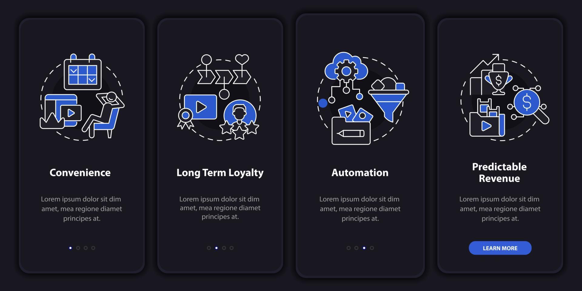 Benefits of subscription night mode onboarding mobile app screen. Walkthrough 4 steps graphic instructions pages with linear concepts. UI, UX, GUI template. Myriad Pro-Bold, Regular fonts used Pro Vector