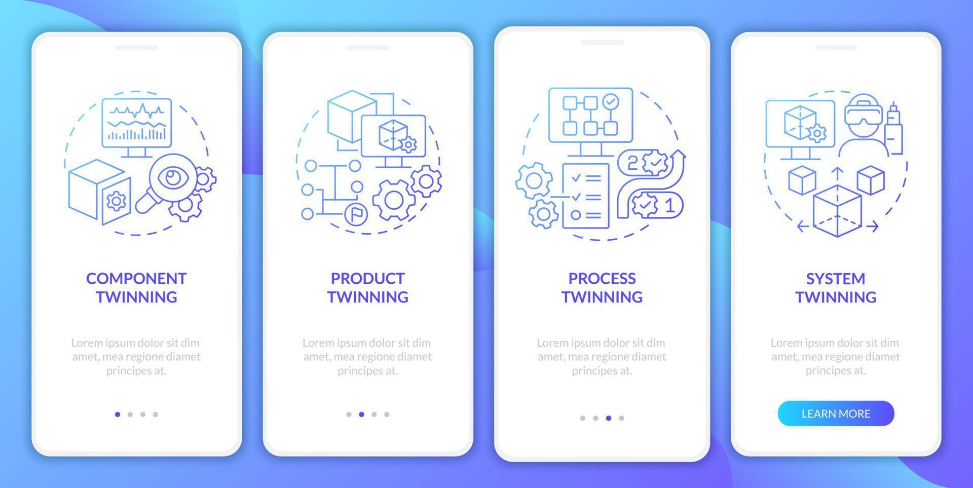 Twinning levels blue gradient onboarding mobile app screen. System twin walkthrough 4 steps graphic instructions pages with linear concepts. UI, UX, GUI template. Myriad Pro-Bold, Regular fonts used Pro Vector