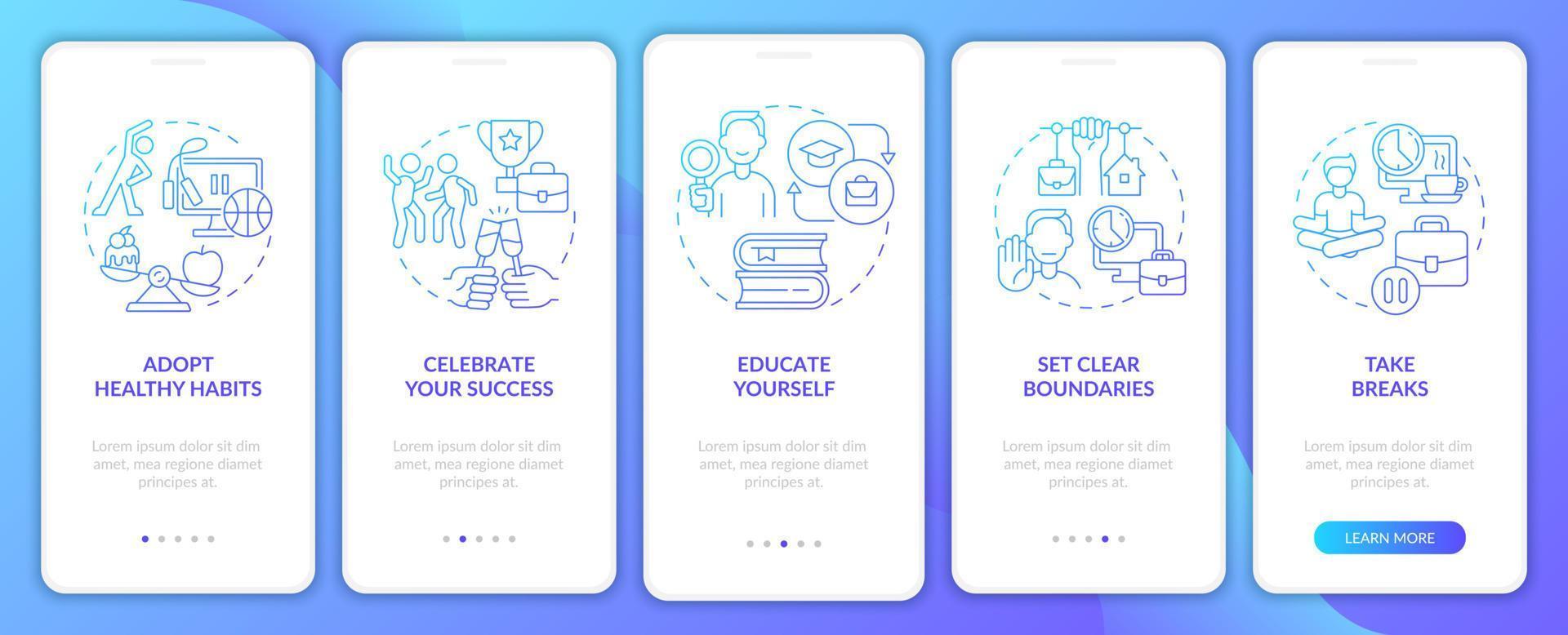 Anxiety avoiding at work blue gradient onboarding mobile app screen. Tips walkthrough 5 steps graphic instructions pages with linear concepts. UI, UX, GUI template. Myriad Pro-Bold, Regular fonts used Pro Vector