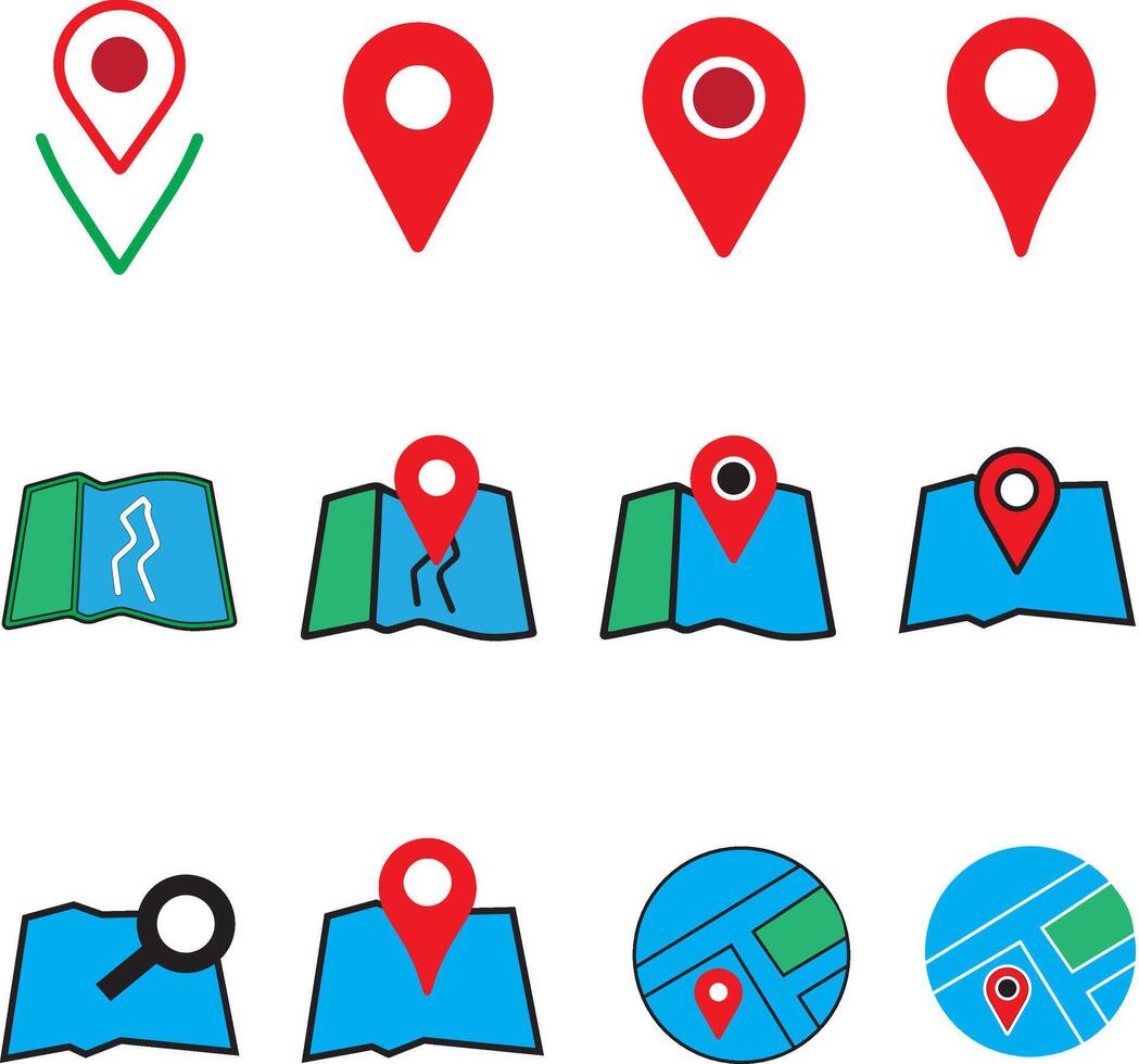 Map and Location Icon Set - Red Pin, Folded Map, Navigation, and GPS Symbols for Travel, Direction and Geo-Targeting vector