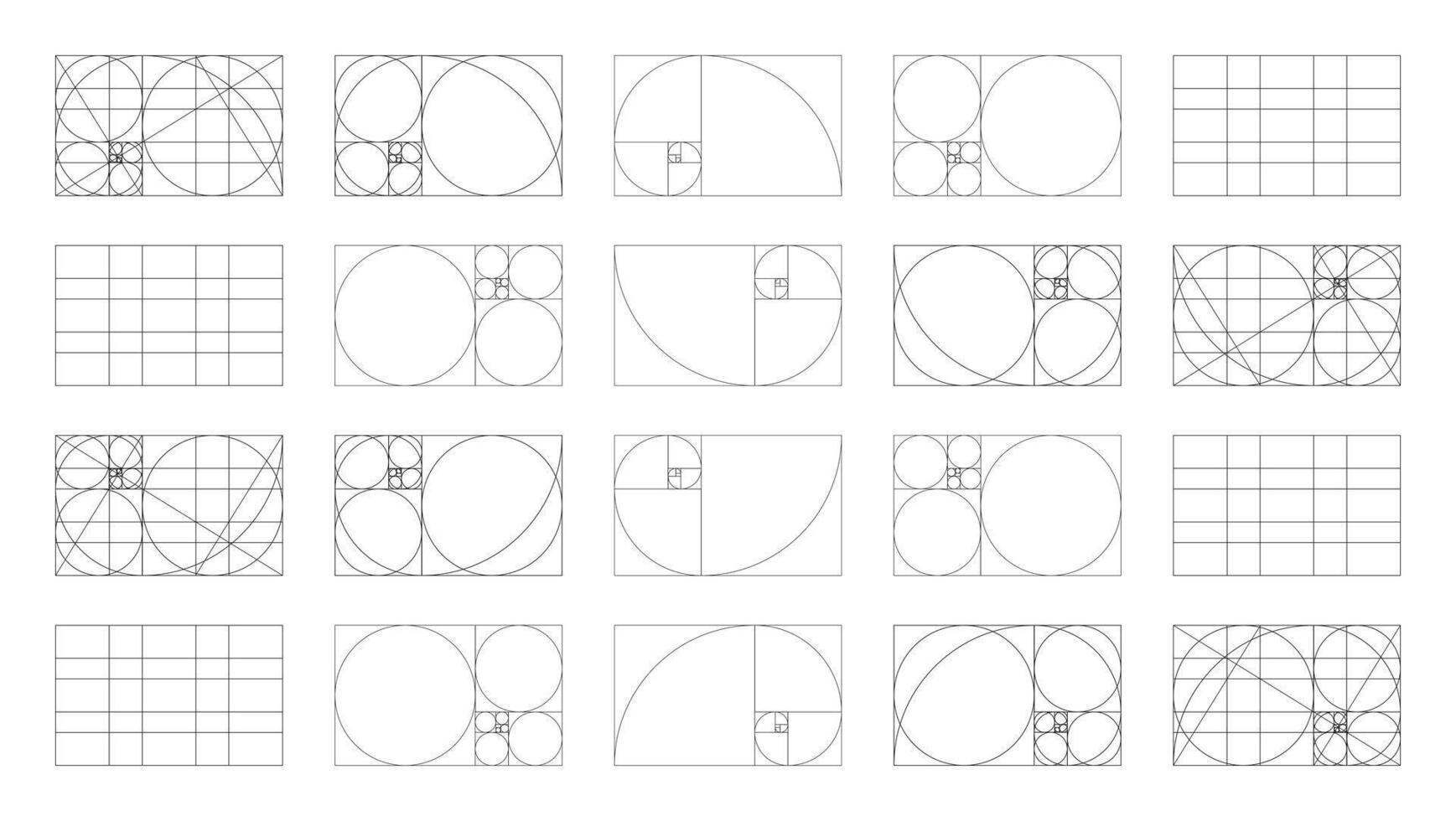 Golden ratio template big set. Fibonacci array, numbers forms. Method golden section samples. Harmony proportions frames. Outline graphic thin illustration. Pro Vector