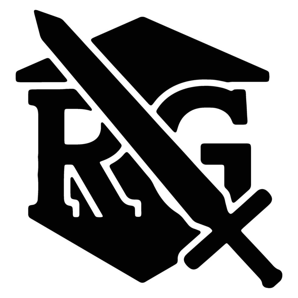 Monochrome icon representing a fantasy adventure guild, featuring a classic longsword and monogram within a geometric shield Pro Vector