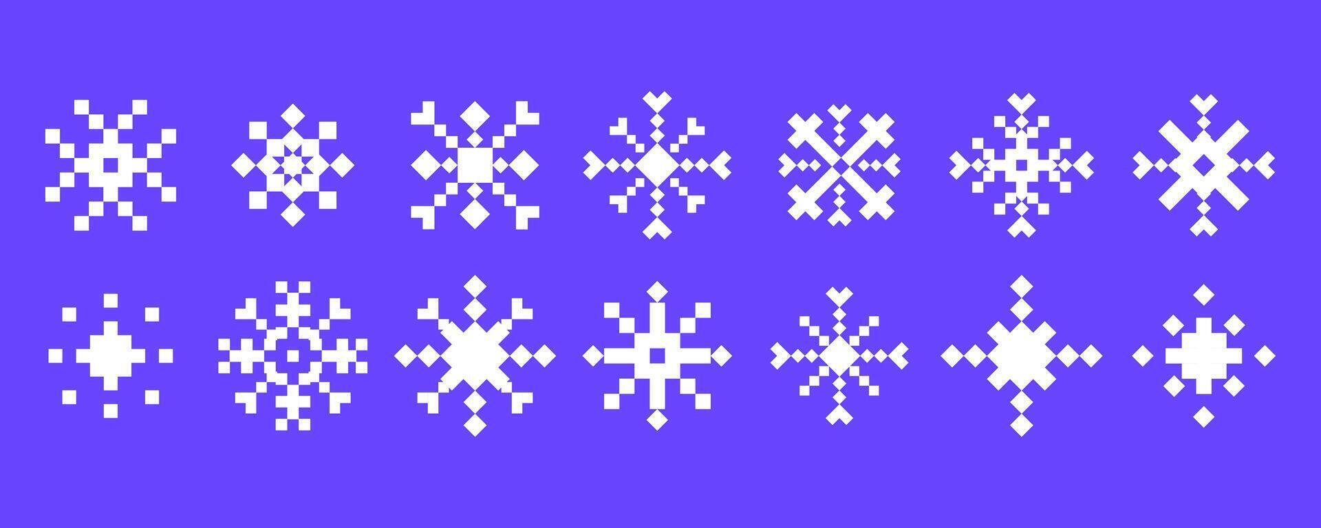 Abstract Snowflakes icon set. Set of white pixel snowflake icons in geometric style on purple background for web design,logo, emblem, print, UI, mobile apps, and digital projects. illustration Pro Vector