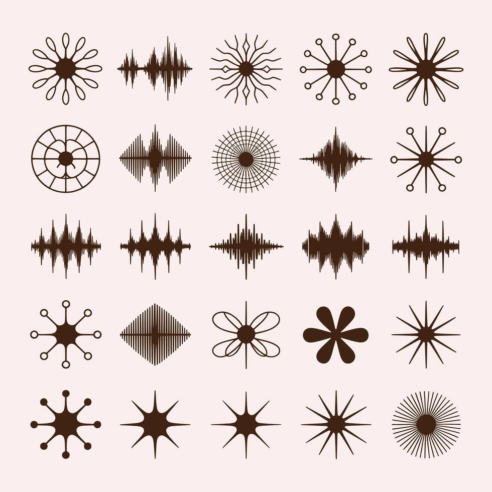Collection of abstract starbursts and sound wave graphics in brown on pink background pattern Pro Vector