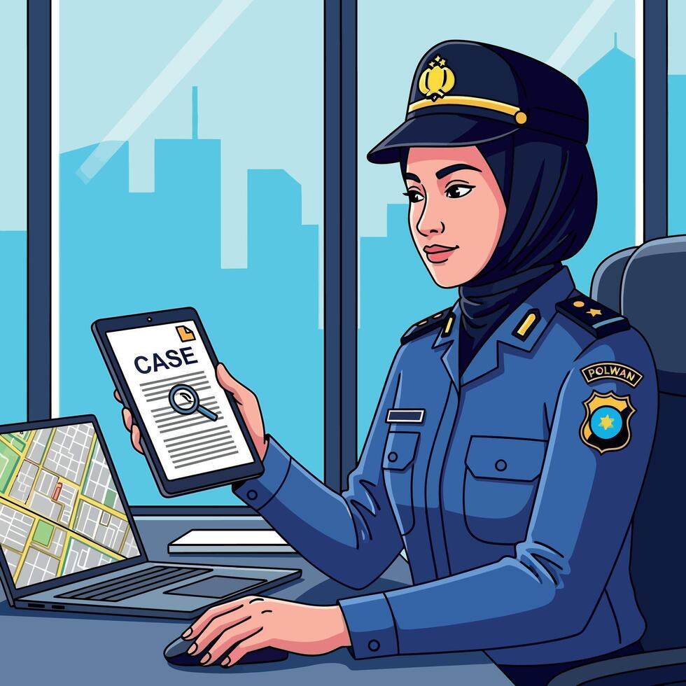 Modern female law enforcement officer diligently analyzes digital case files and utilizes advanced geospatial mapping technology, embodying dedicated police work in a dynamic urban setting Pro Vector