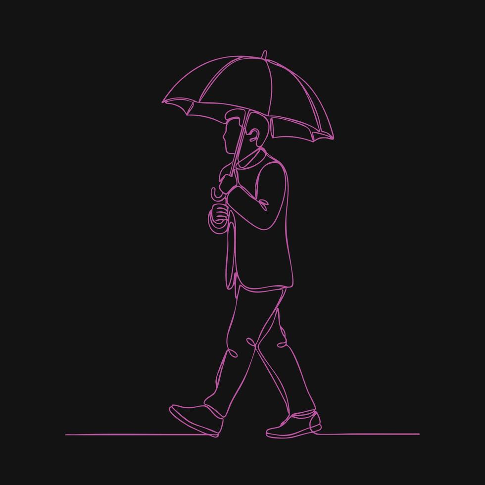 Neon outline of a person walking with an umbrella on a dark , emphasizing minimalistic and modern style design vector