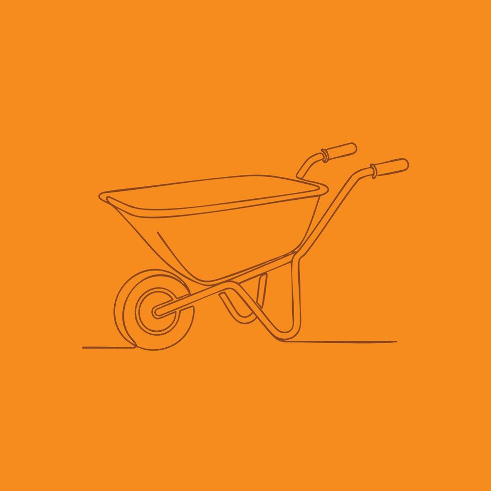 Minimalist line drawing of a wheelbarrow with a large container and handles on an orange vector