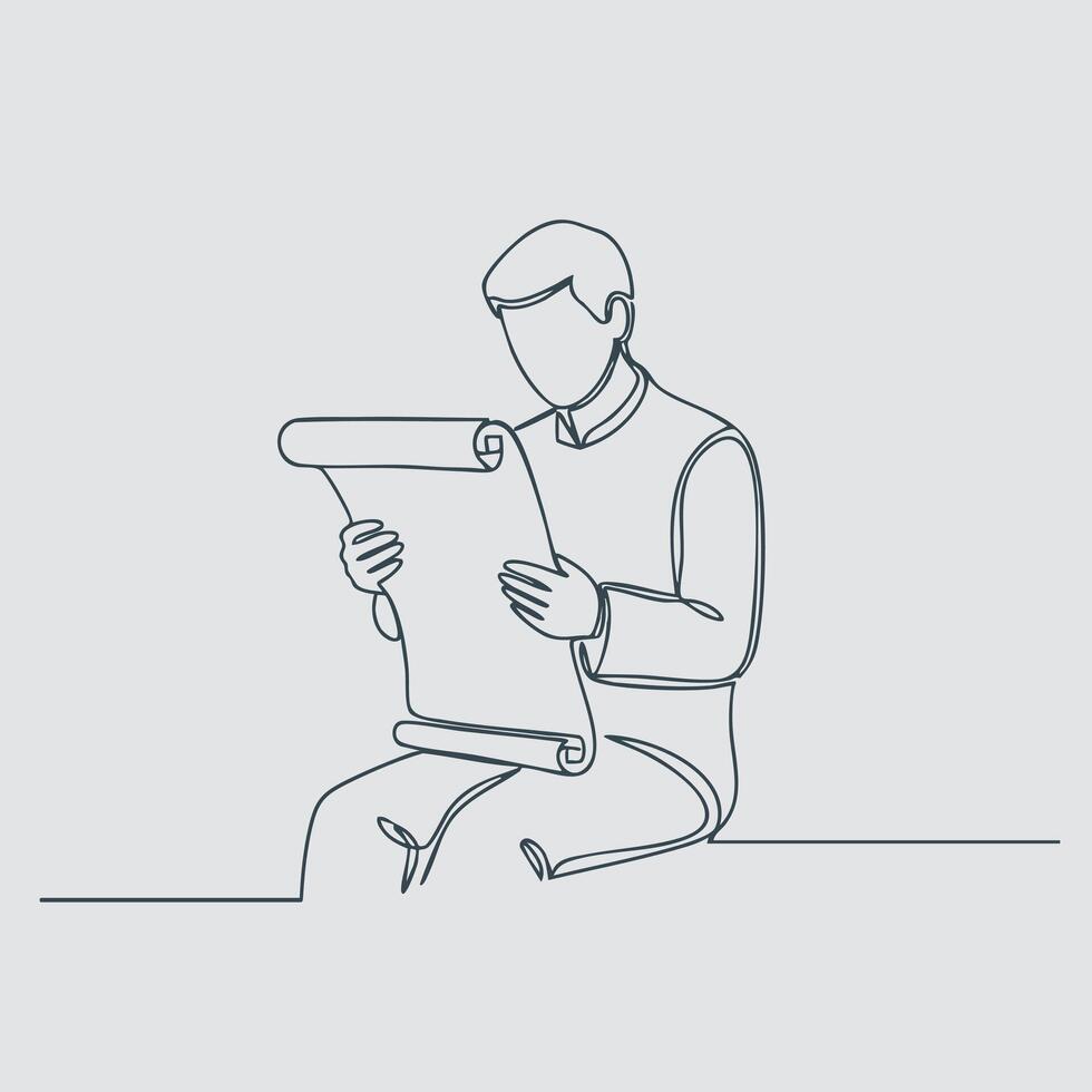 Minimalist line drawing of a person sitting and reading a rolled-up document or blueprint with a focused posture vector