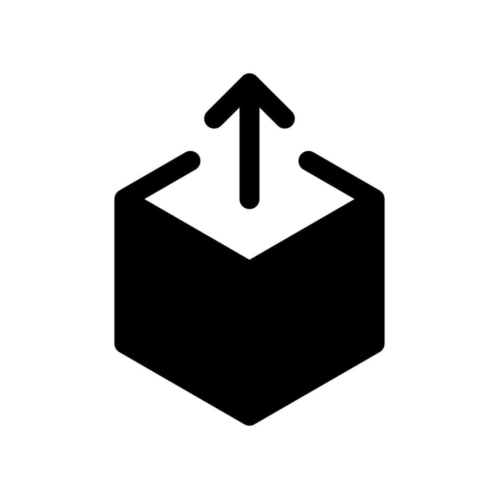 A simple filled icon of a wrapped package box with an up arrow for software upload. vector