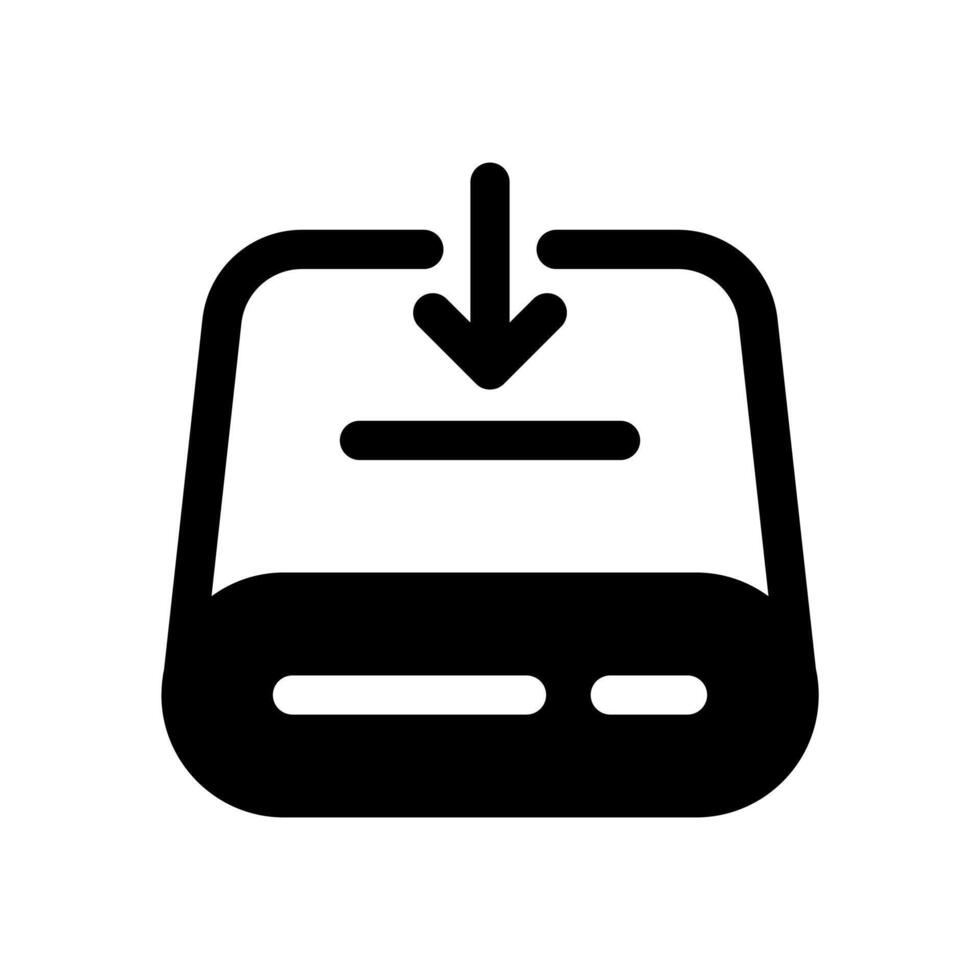 A solid icon of a network server rack with a down arrow for data retrieval download. vector