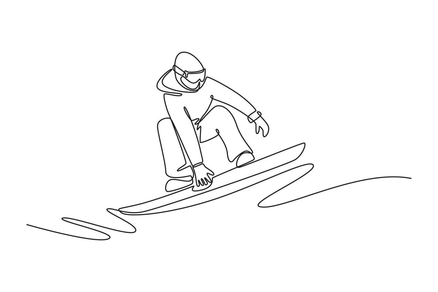 Continuous one line drawing guy wearing goggles, hoodie is snowboarding in low, crouched stance, extending hand to snow for balance. Dynamic flow. Single line draw design graphic illustration Pro Vector