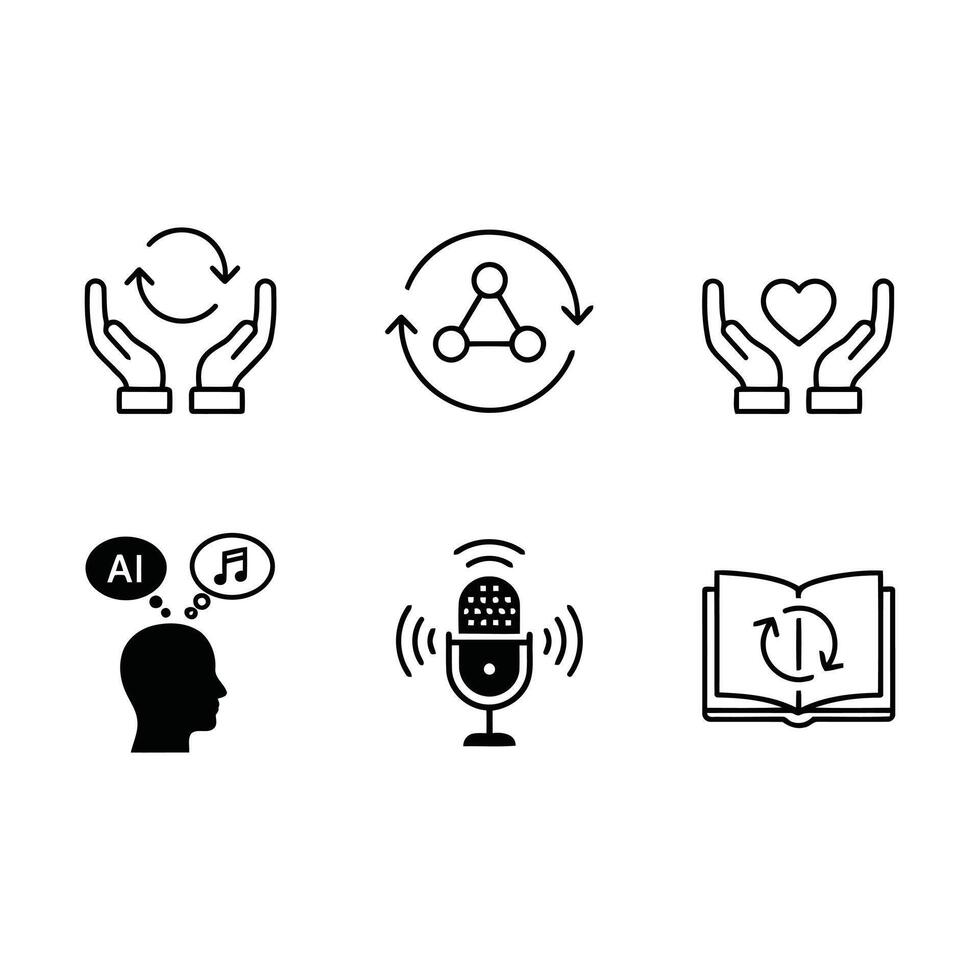Minimalist line icons on a clean white background illustrating key concepts of communication, innovation, AI, learning, care, and interconnectedness for modern graphic design Pro Vector