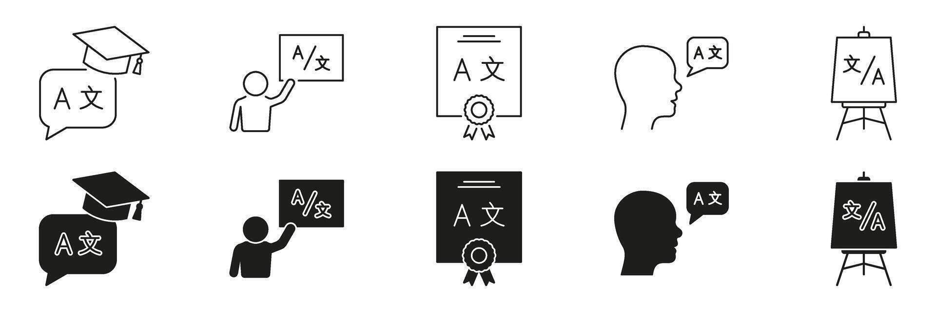 Language Learning Line And Solid Icon Set. Education, Certification, And Communication Symbol Collection. Includes Graduation Cap, Speech Bubble, And Presentation. Isolated Illustration Pro Vector