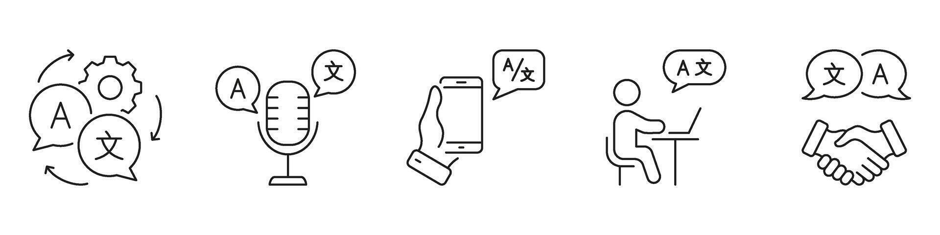 Language Translation And Communication Line Icon Set. Multilingual Interaction, Speech Translation And Communication Outline Symbol Collection. Editable Stroke. Isolated Illustration Pro Vector