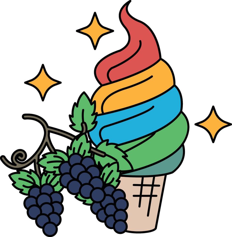 A drawing of a grapefruit and a grape ice cream cone Pro Vector