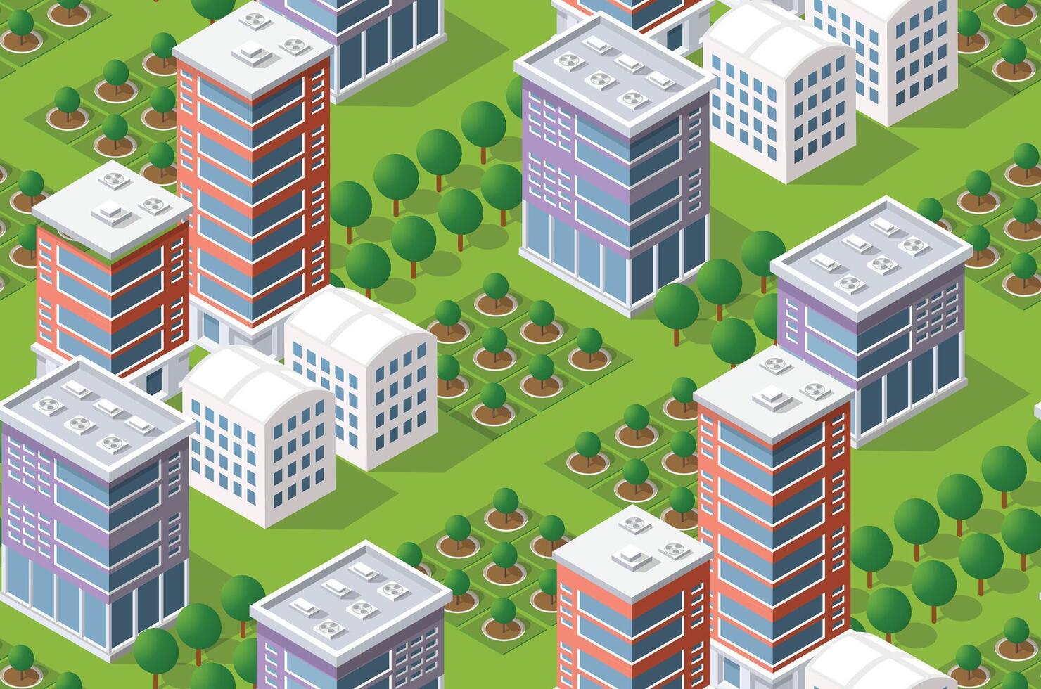 Isometric seamless pattern with skyscrapers and trees Pro Vector