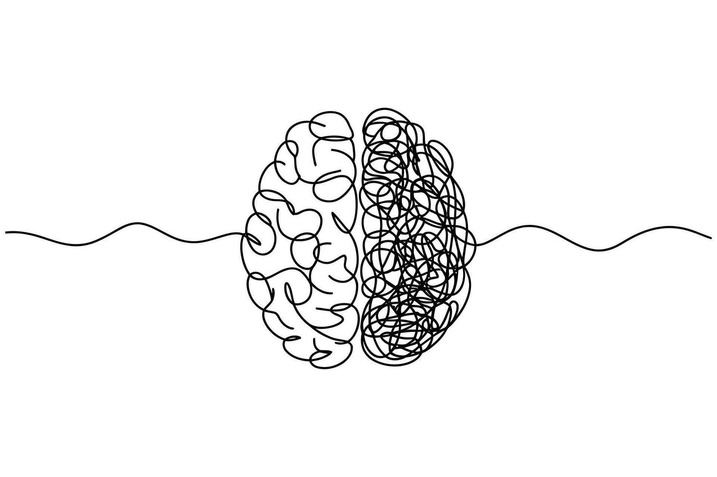 Abstract illustration of a human brain divided into two halves showing order and chaos with a wavy line connecting them Pro Vector