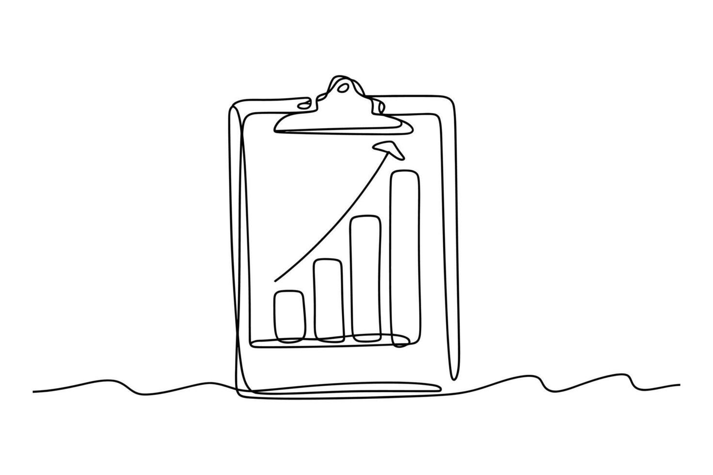 Minimalist continuous line drawing of a clipboard displaying a rising bar graph with an upward trending arrow indicating growth and success Pro Vector