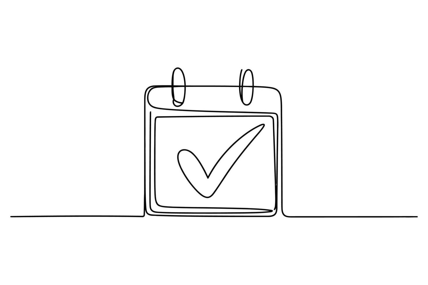 Simple continuous line drawing of a calendar page with a large checkmark symbolizing completion or a scheduled event Pro Vector