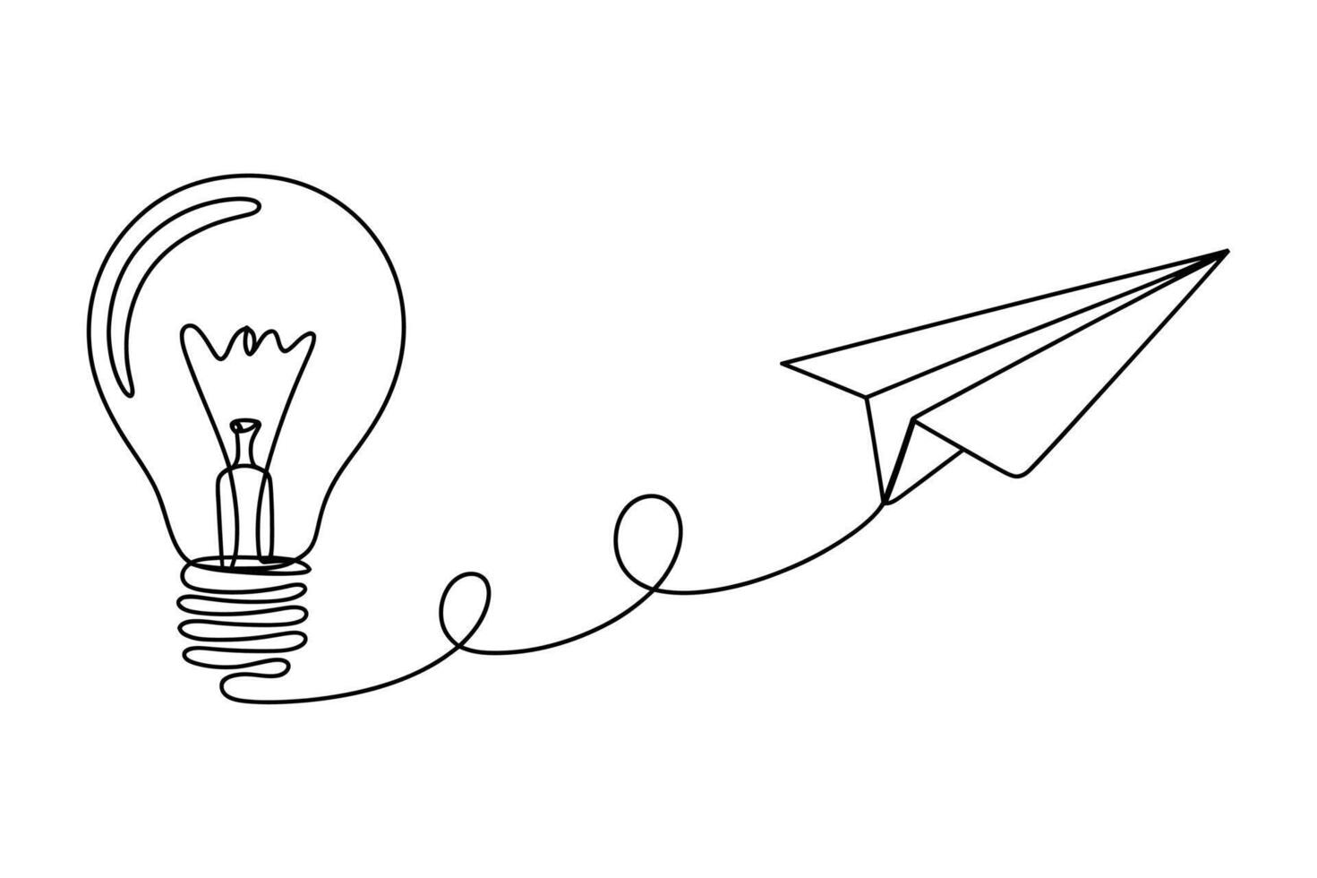 Minimalist single line drawing of a light bulb connected by a dashed line to a paper airplane symbolizing innovation and creativity Pro Vector
