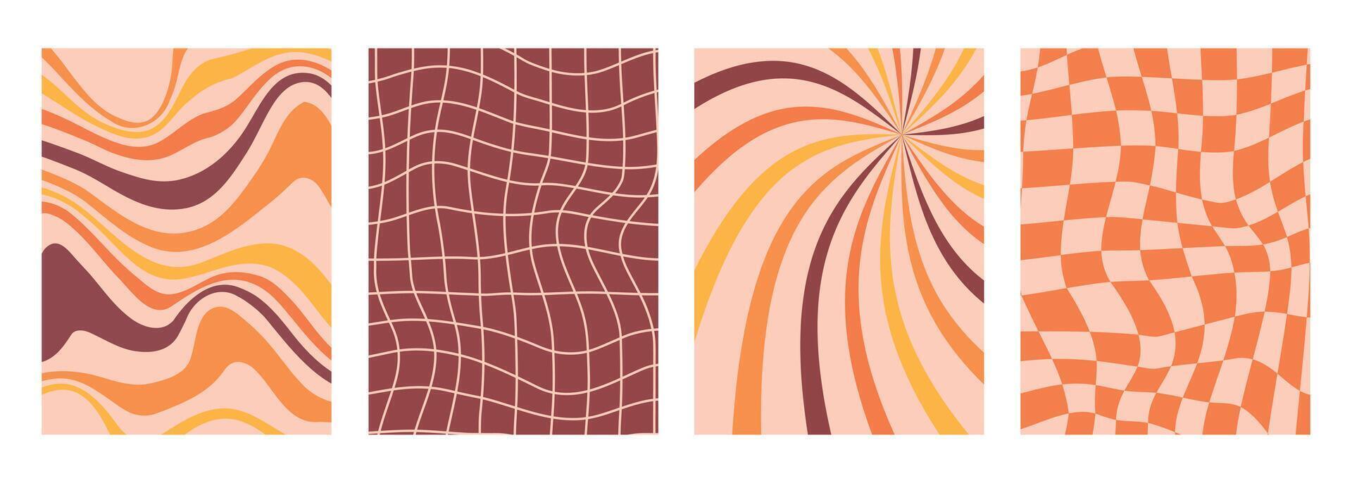 Set of four retro abstract backgrounds featuring wavy lines, distorted grids, swirl bursts, and checkerboard patterns in warm 70s-inspired tones Pro Vector
