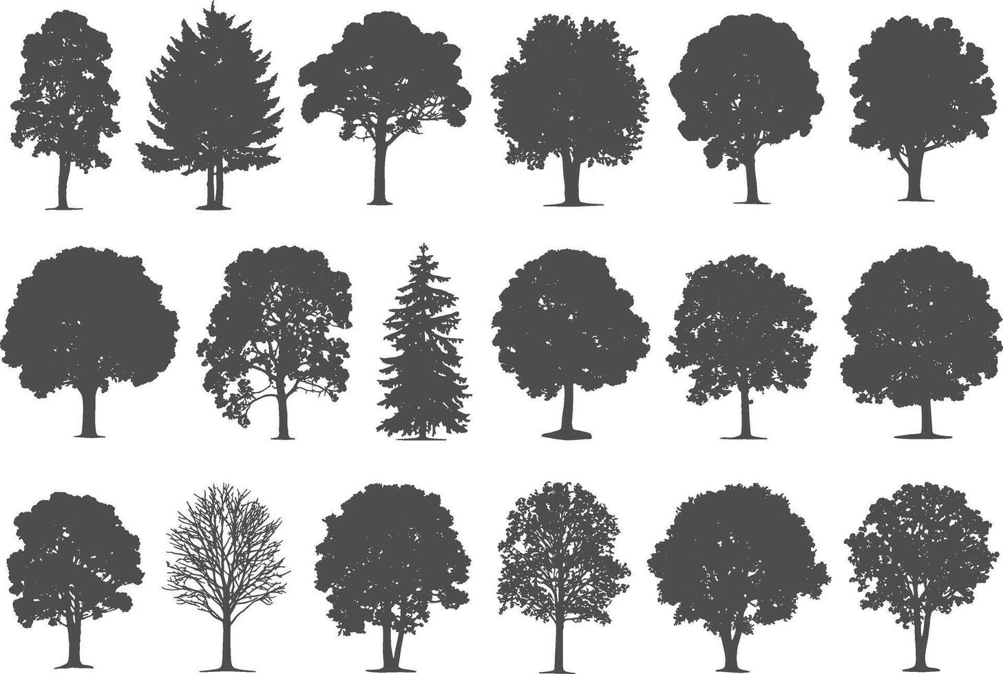 Assortment of deciduous and coniferous tree silhouettes arranged in three rows vector